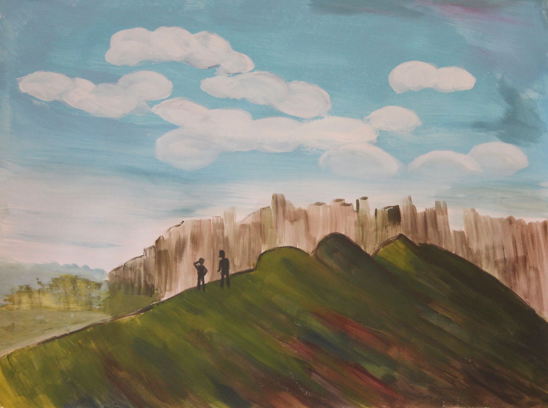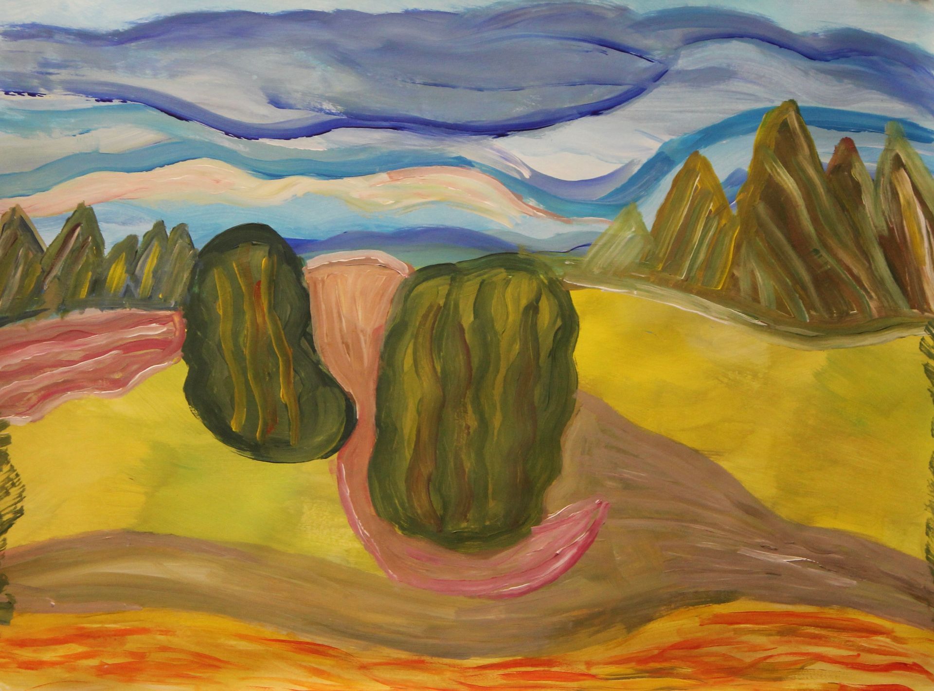 De deelnemers hebben drie lessen geëxperimenteerd met het overlopen van kleuren in de achtergrond. Vanavond komen de vormen terug in het landschap. In de schilderijen van Munch zie je juist een expressieve lijnvoering en vormen, dit vraagt een geheel andere manier van werken van de cursisten. Gaat dit lukken?
