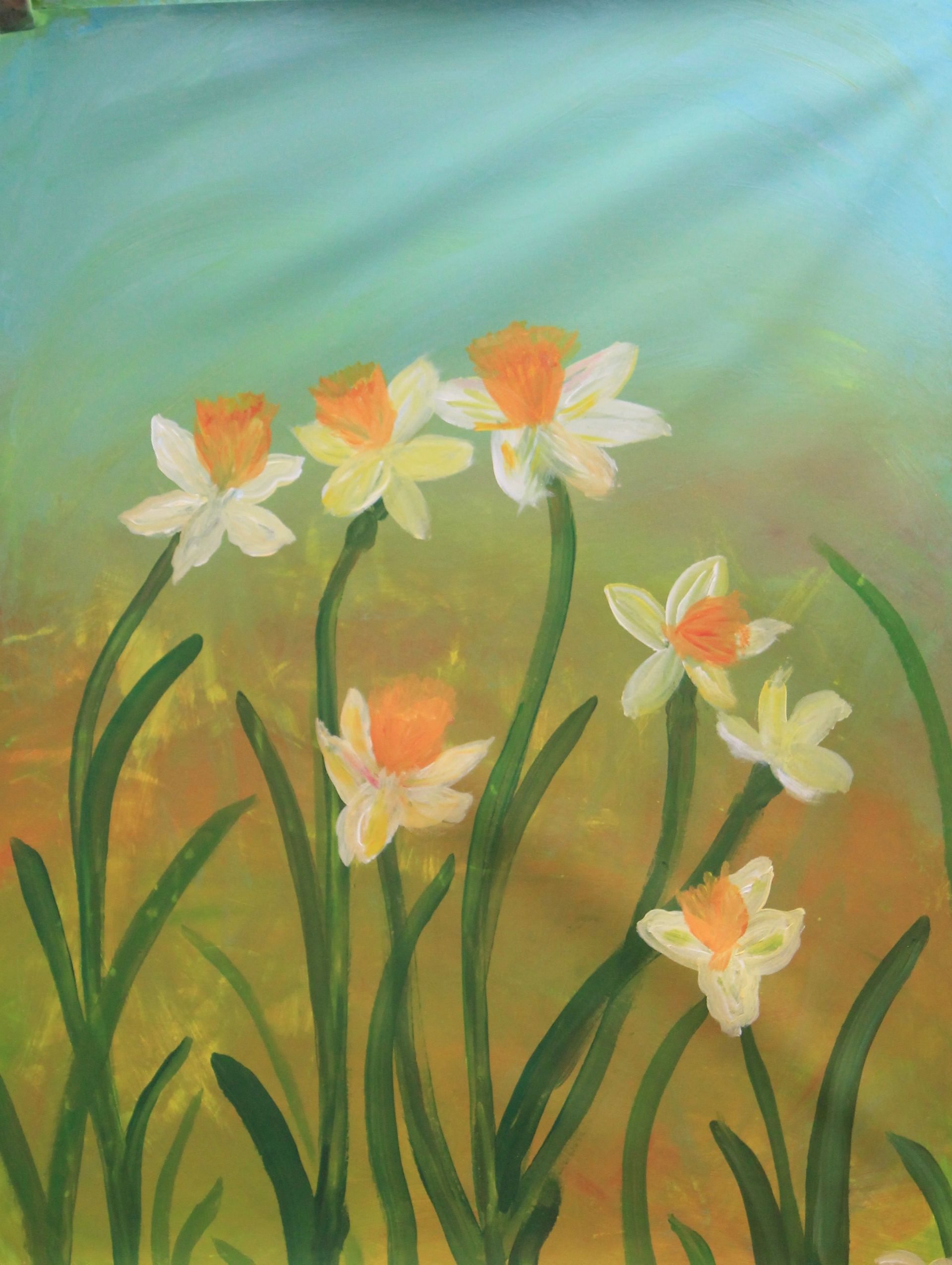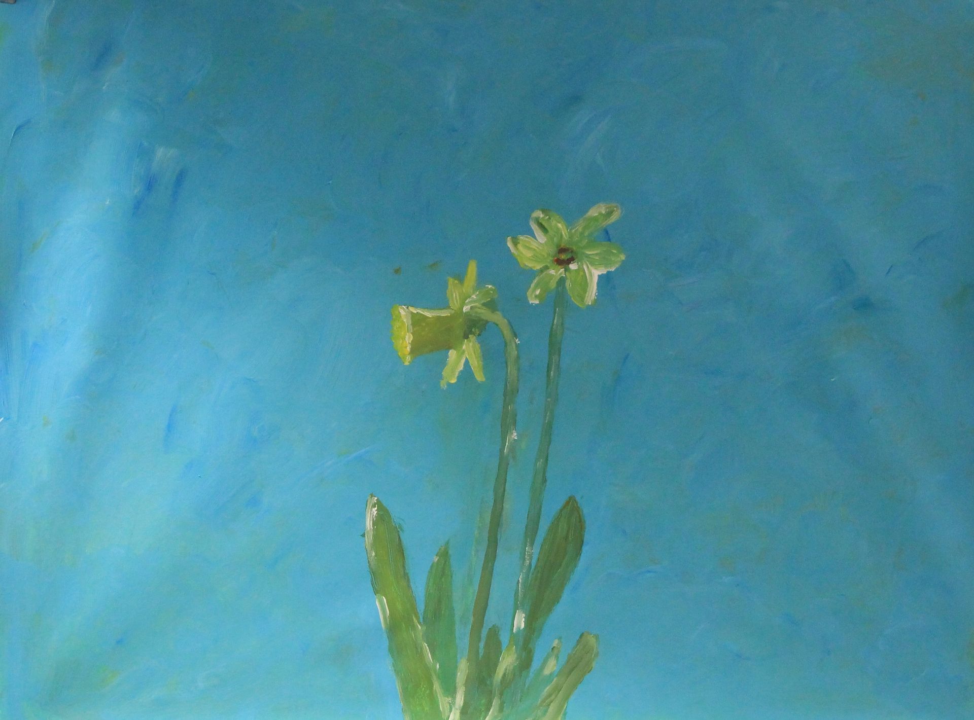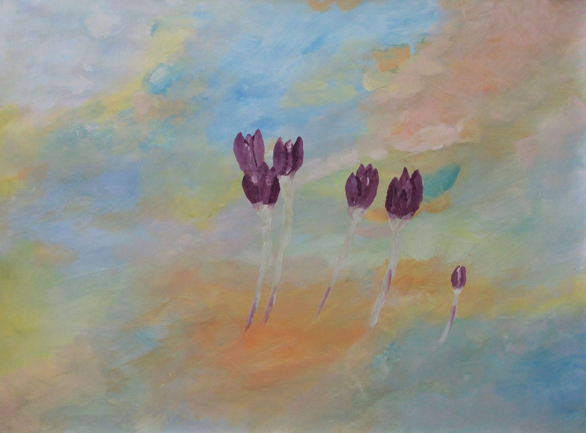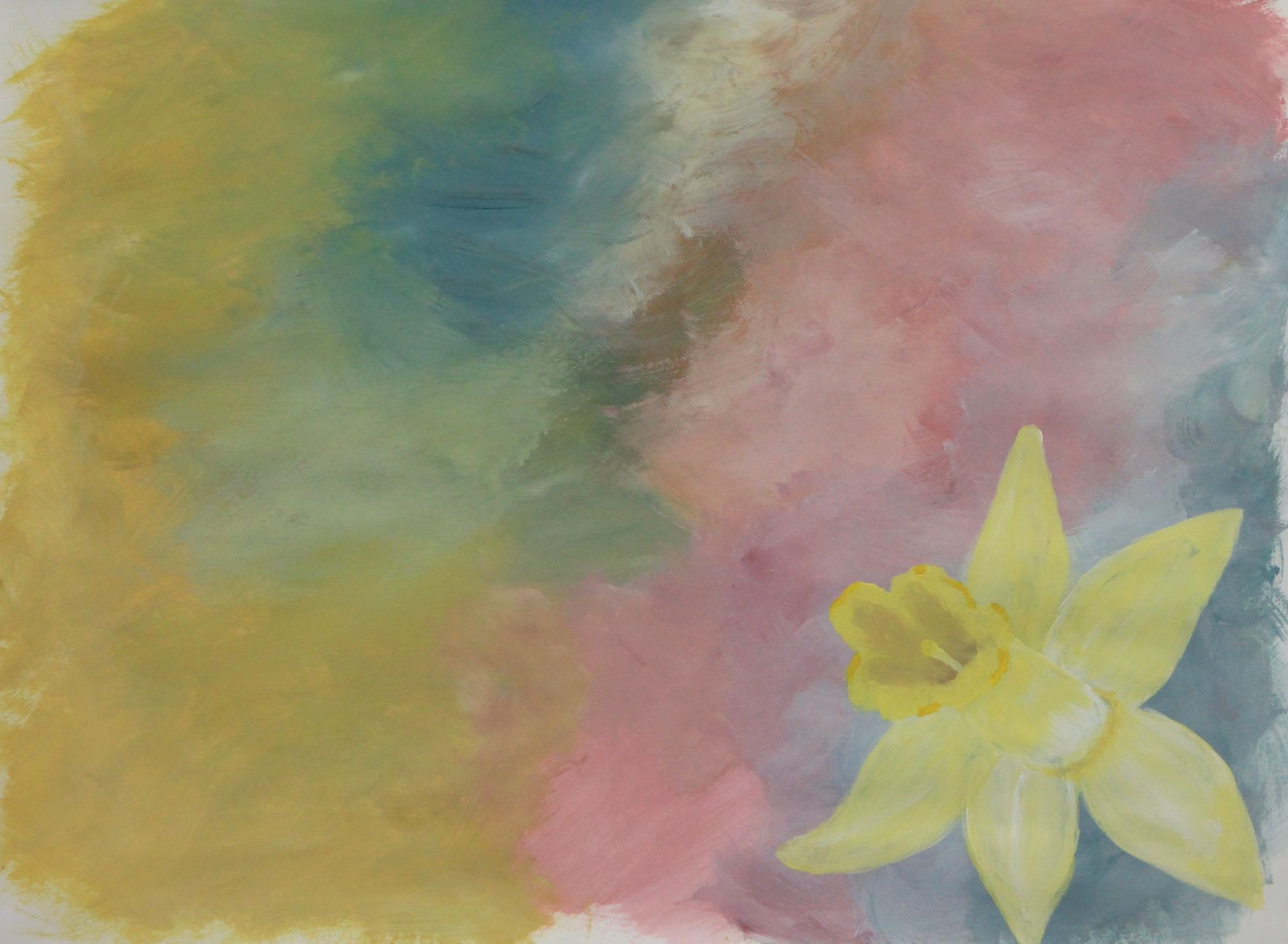 We beginnen opnieuw met het schilderen van een achtergrond. De opdracht is een voorjaarslucht, met veel licht en zachte kleuren.