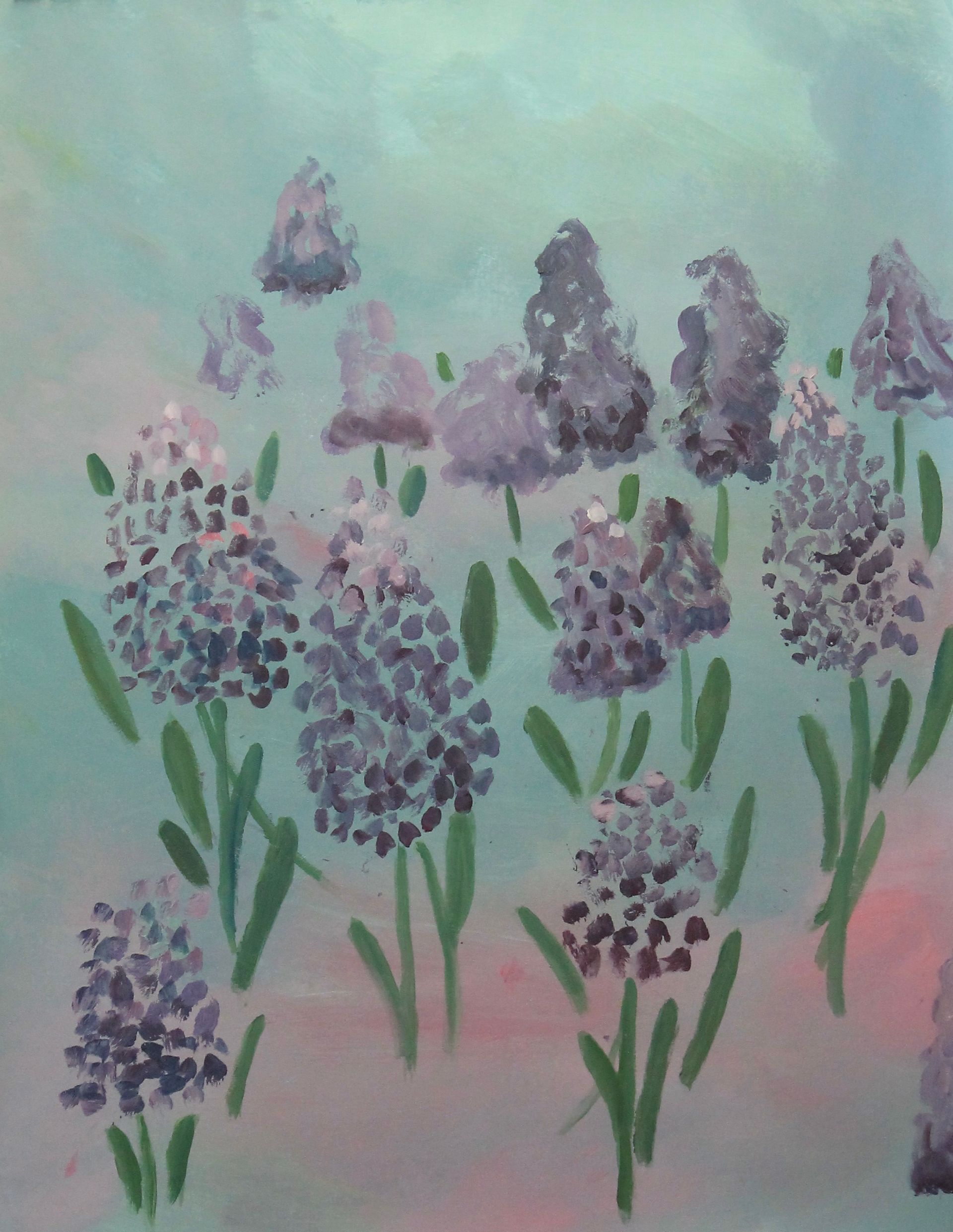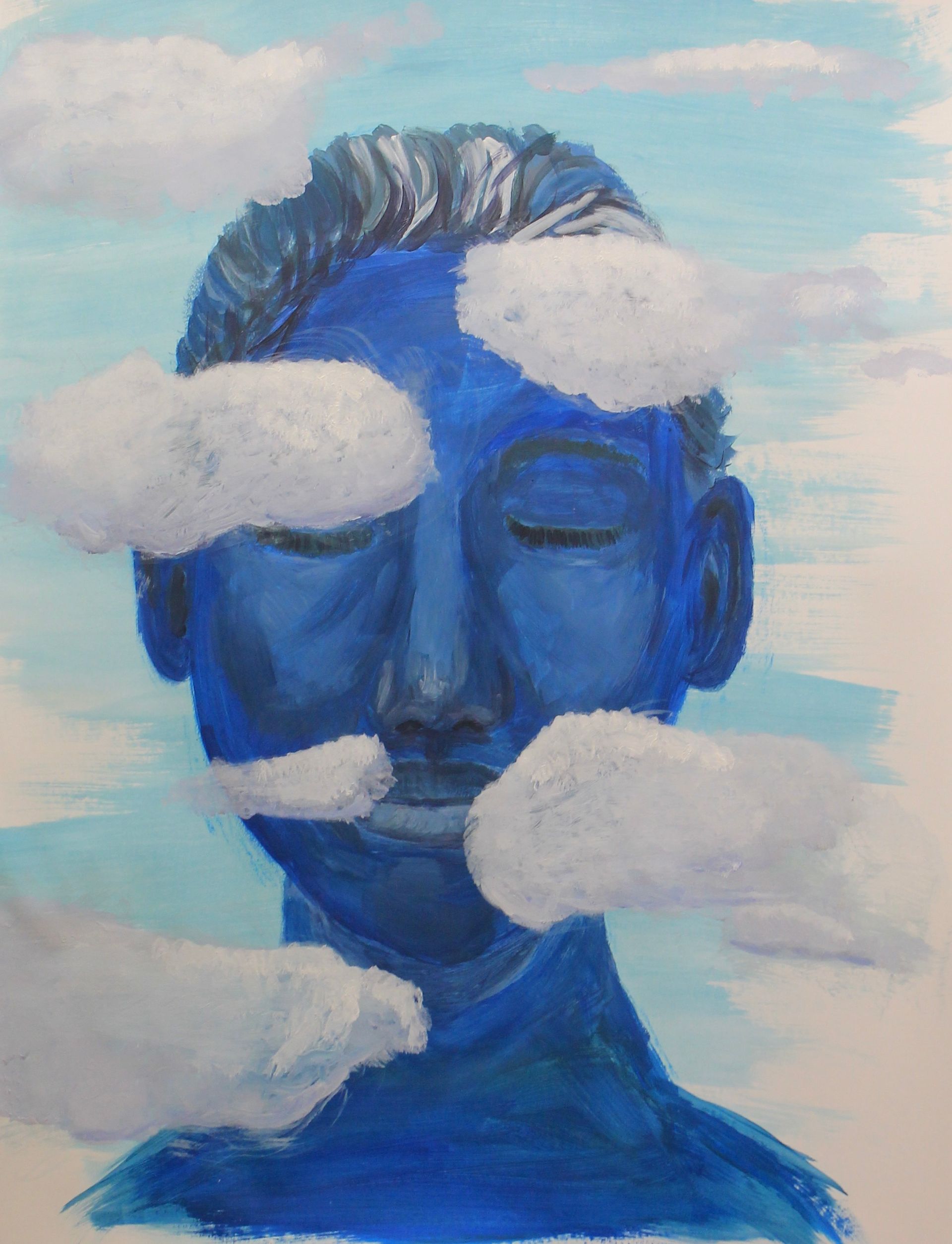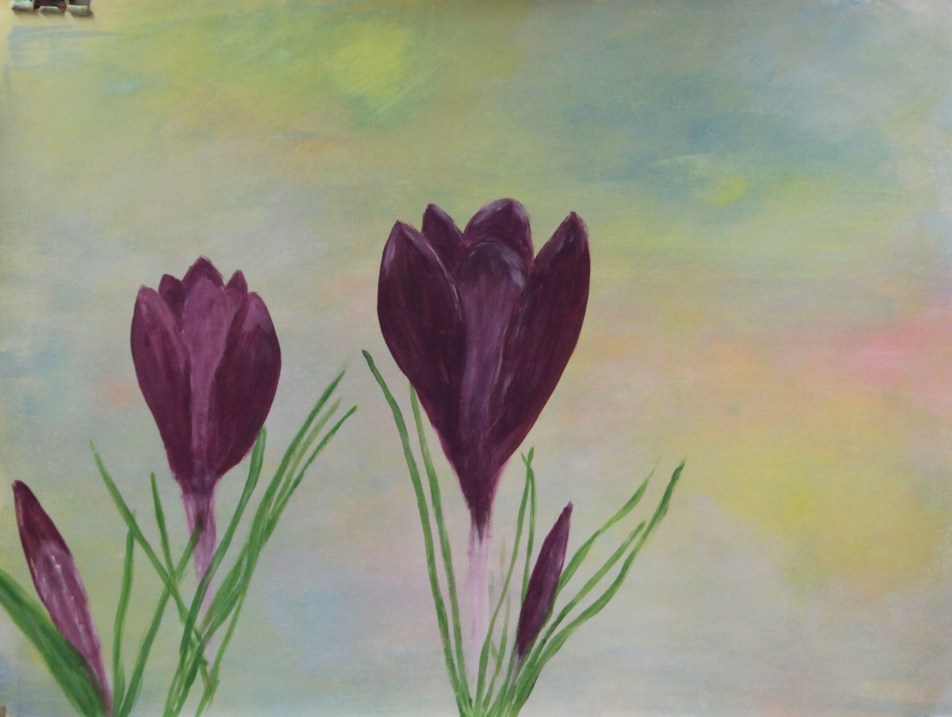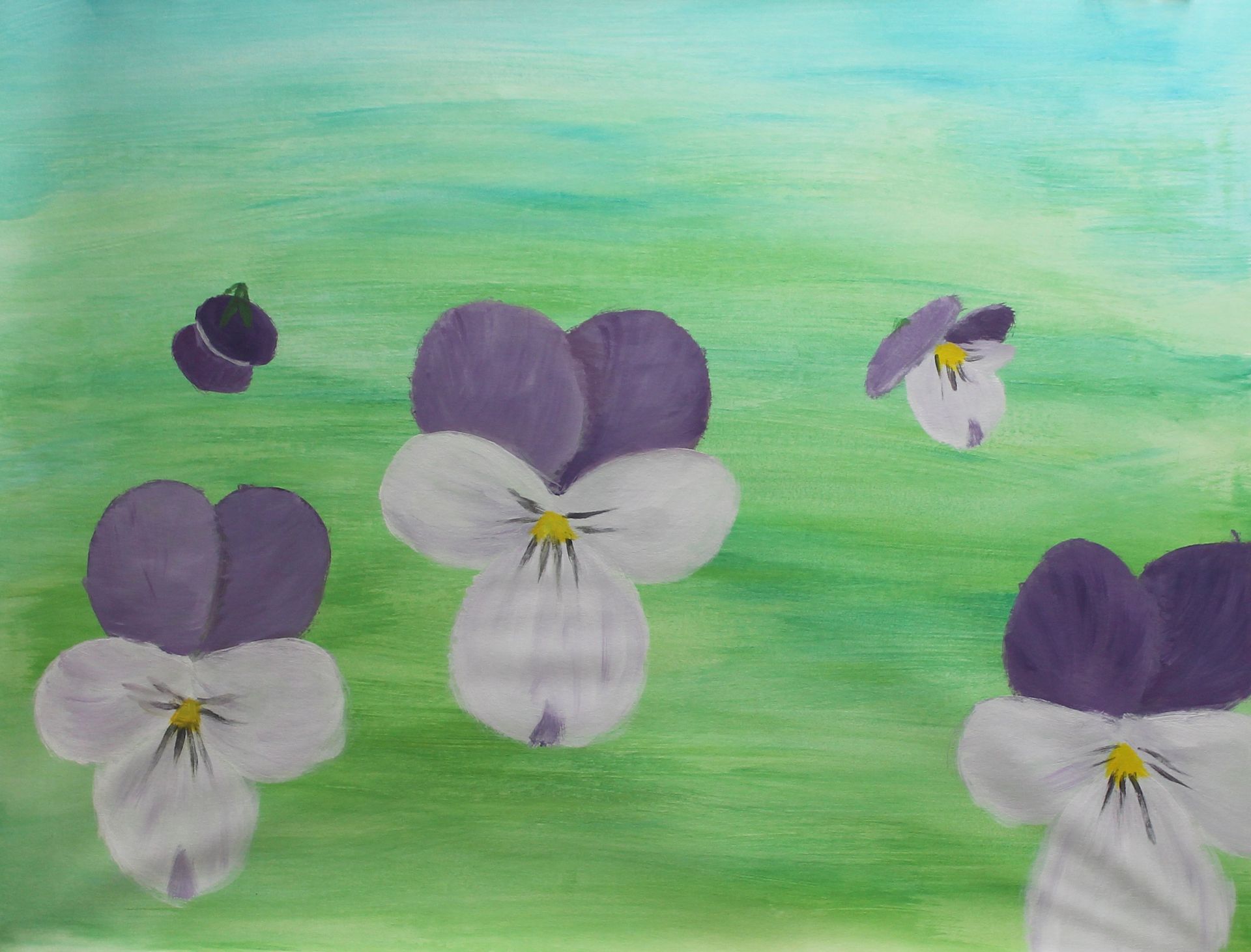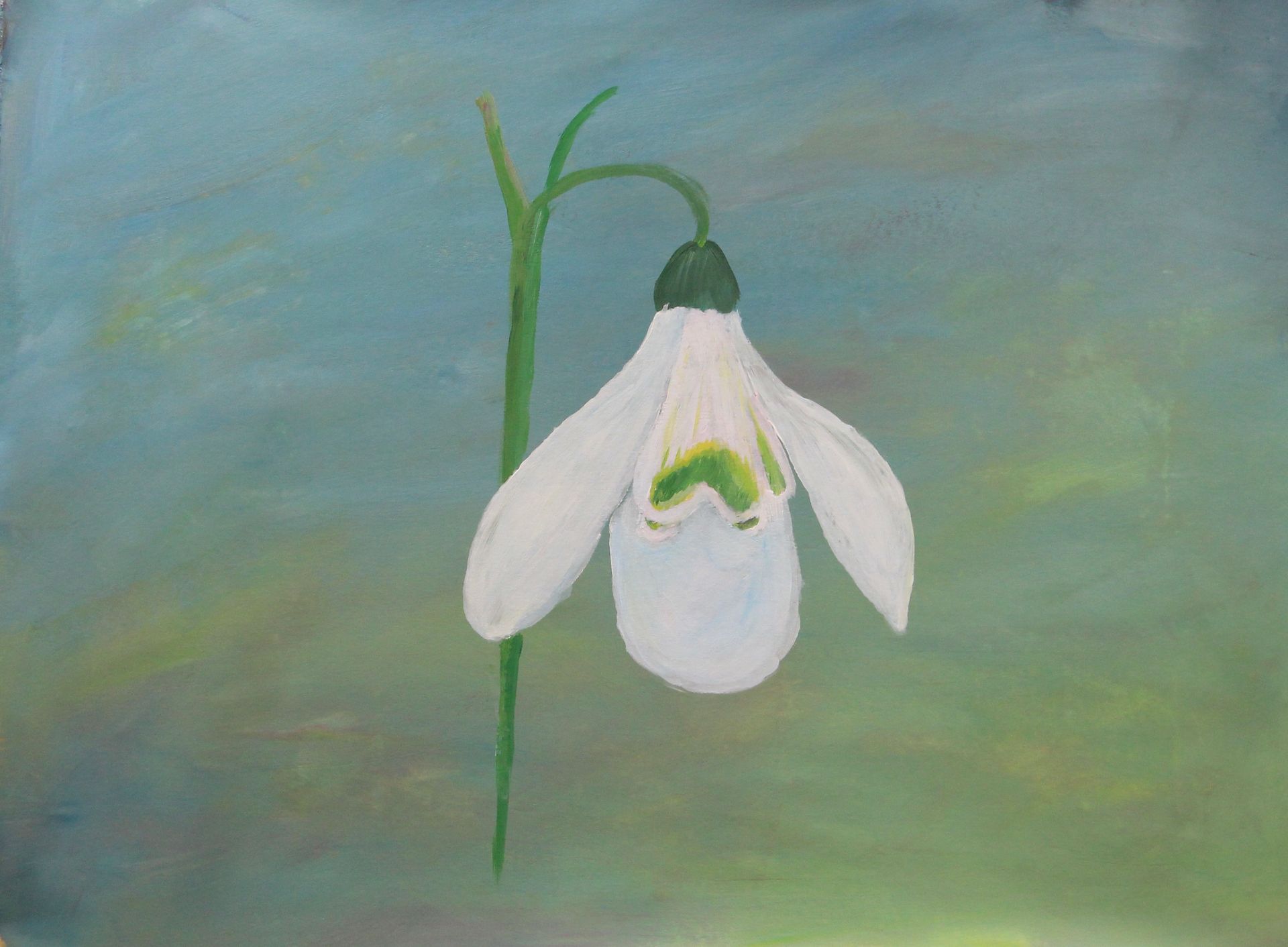 We beginnen opnieuw met het schilderen van een achtergrond. De opdracht is een voorjaarslucht, met veel licht en zachte kleuren.