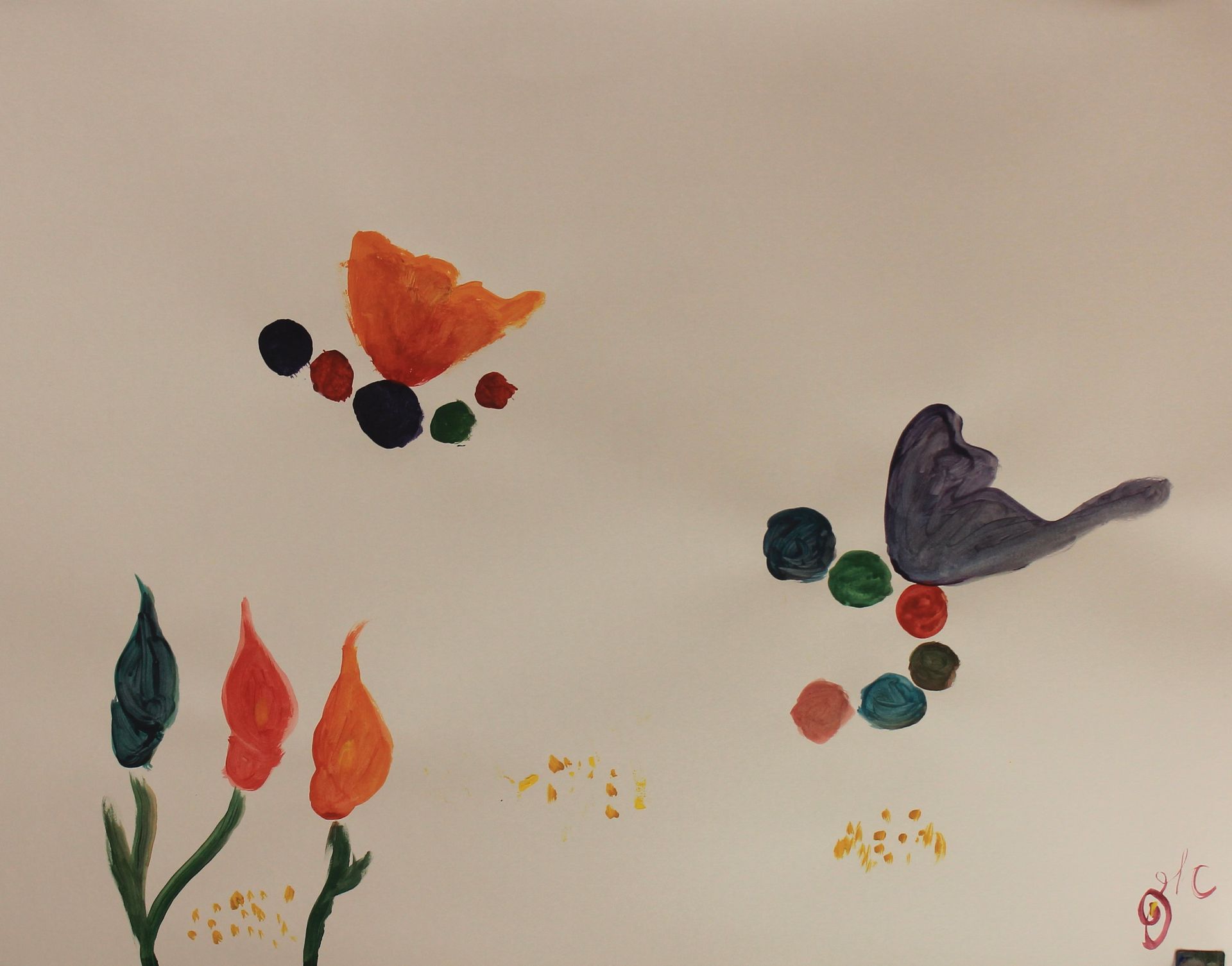 Marthe maakt van het beeldje twee vlinders met acrylverf, heel precies, en voegt er bloemen aan toe.